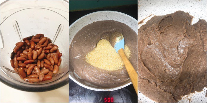 Cho đậu vào máy xay sinh tố xay nhuyễn rồi cho đậu đỏ và đường vào chảo sên cho đậu đặc lại là được.