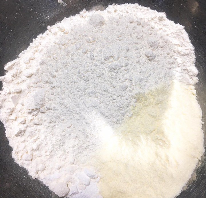 Trong 1 cái âu khác cho bột cake flour, bột sữa, baking powder vào trộn đều, rây lại bột cho bột khỏi bị vón cục.