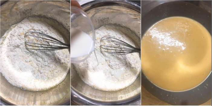 Cho từ từ hỗn hợp bột vào âu đựng trứng. Thêm vào 50ml sữa tươi khuấy đều. Dùng màng bọc thực phẩm bọc kín lại. Để bột nghỉ 20 phút. Sau khi bột nghỉ đủ thời gian thì cho thêm 1 thìa cà phê nước lọc vào bột và khuấy đều.