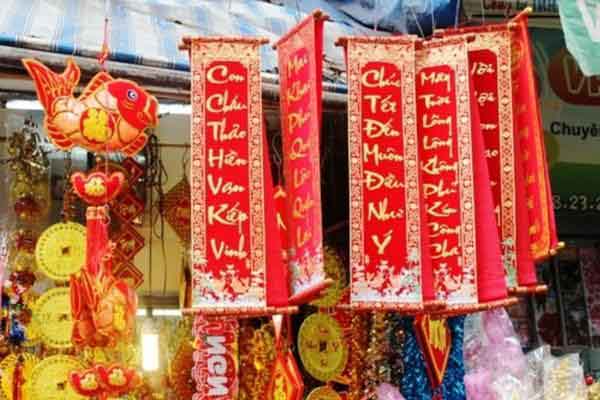 Các chữ Hán Việt có thể kể đến các câu thông tục như: mã đáo thành công, phát tài, phát lộc, an khang thịnh vượng, đa phúc đa tài đa phú quý, cung chúc tân xuân,… Tuy hiếm nhưng một số câu chúc thuần Việt cũng xuất hiện tại các cửa hàng bán đồ trang trí Tết như: chúc Tết trăm điều như ý, tiền vào như nước, đào hồng khoe sắc đón xuân sang… Ngoài những câu chúc có vần điệu như trên, câu chúc hút khách còn có những nét chữ riêng như Phúc, An, Tết, Lộc, Tấn. Tất cả đều thể hiện mong muốn có một năm mới thịnh vượng và suôn sẻ.