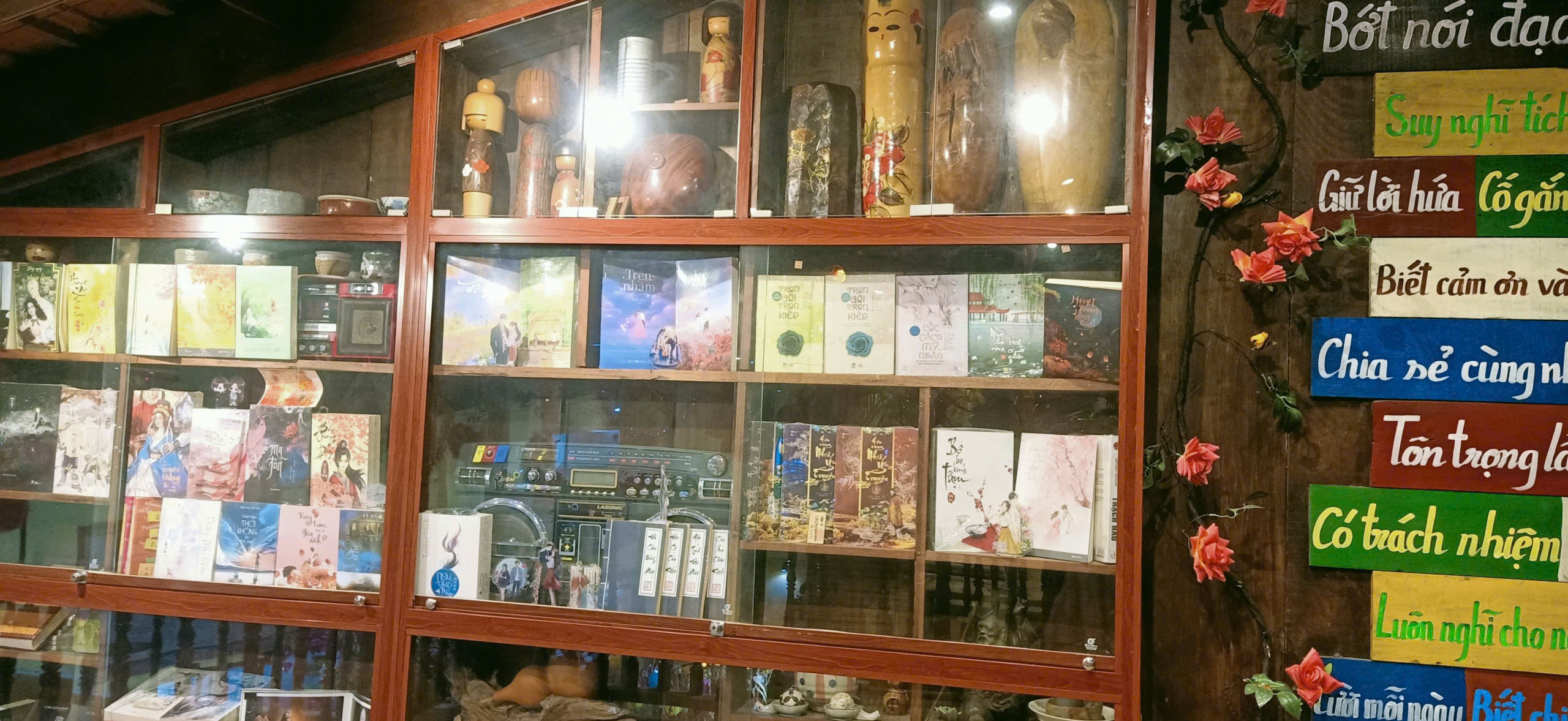 Ú Cà Phê Kokeshi như một trạm “chữa lành” giữa lòng thành phố. Ở đây, còn có kệ sách với nhiều loại sách khác nhau để mọi người tự do lựa chọn. Chỉ cần kéo nhẹ cánh cửa tủ, bạn có thể đằm chìm vào từng trang sách mà quên cả thời gian.