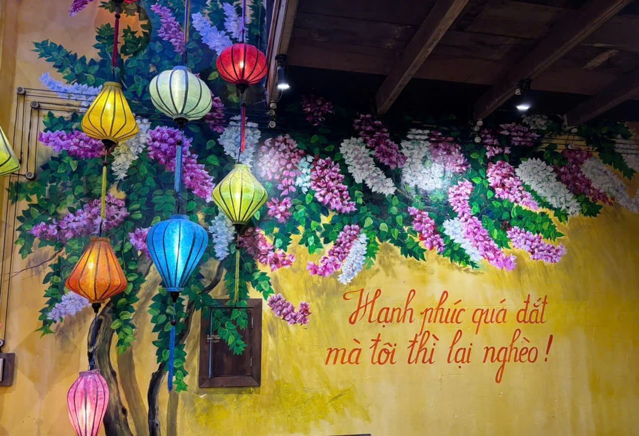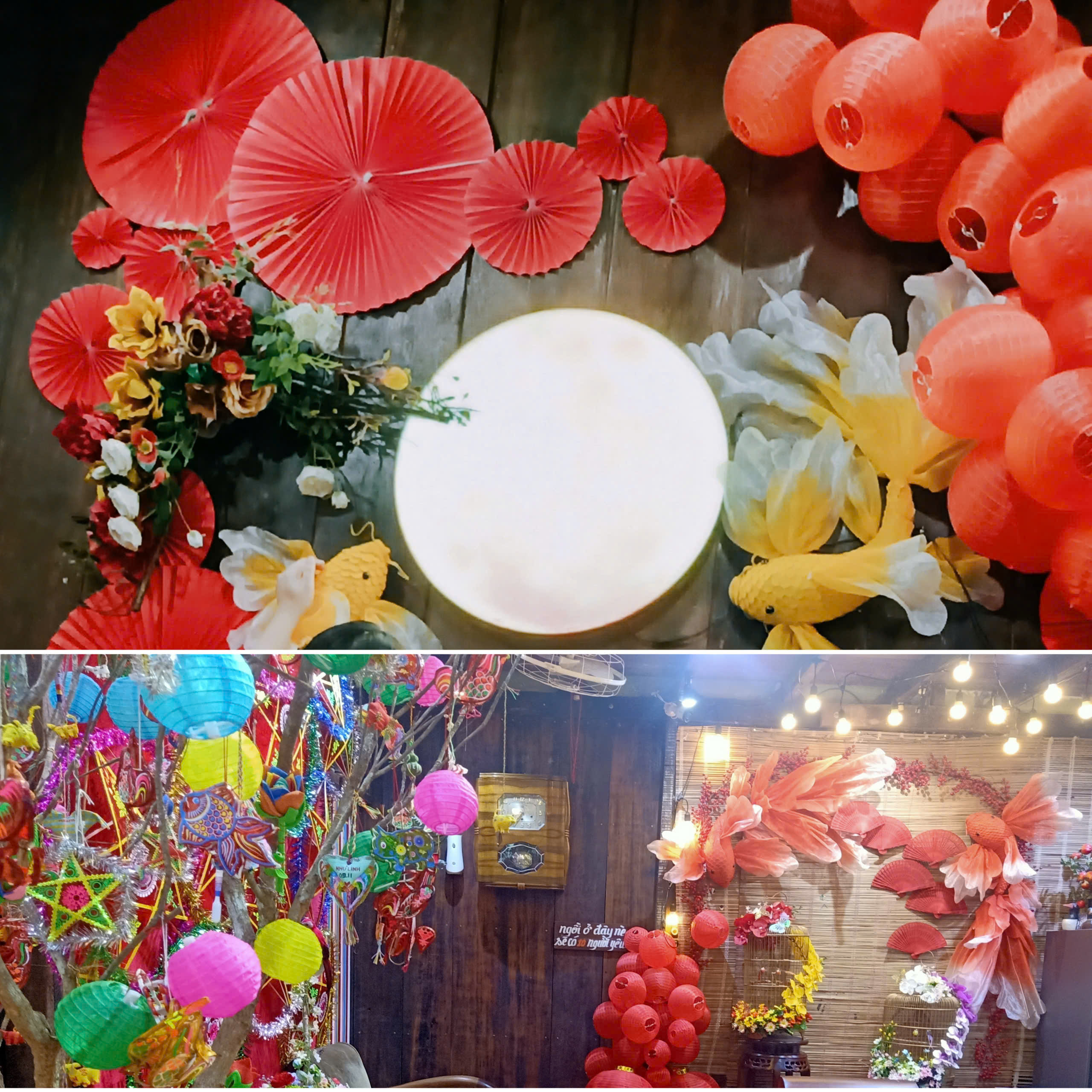 Vì sắp đến Tết Trung thu nên những nét đặc trưng của mùa lễ hội này cũng hiện diện ở khắp mọi nơi. Concept ấn tượng như đưa những vị khách lên một chiếc phi thuyền để du hành khám phá cung trăng. Vầng trăng tròn vành vạnh tỏa ra ánh sáng vàng êm dịu, xung quanh là những con cá chép tung tăng bơi lội, những chiếc quạt được xếp từ những tờ giấy đỏ kết hợp với muôn vàn bông hoa tạo nên một không gian lãng mạn, nên thơ. Những chiếc lồng đèn rực rỡ sắc màu lấp lánh treo quanh quán. Đèn ông sao, đèn kéo quân, đèn lồng tròn,... thu hút khách hàng đến chiêm ngưỡng và chụp ảnh.