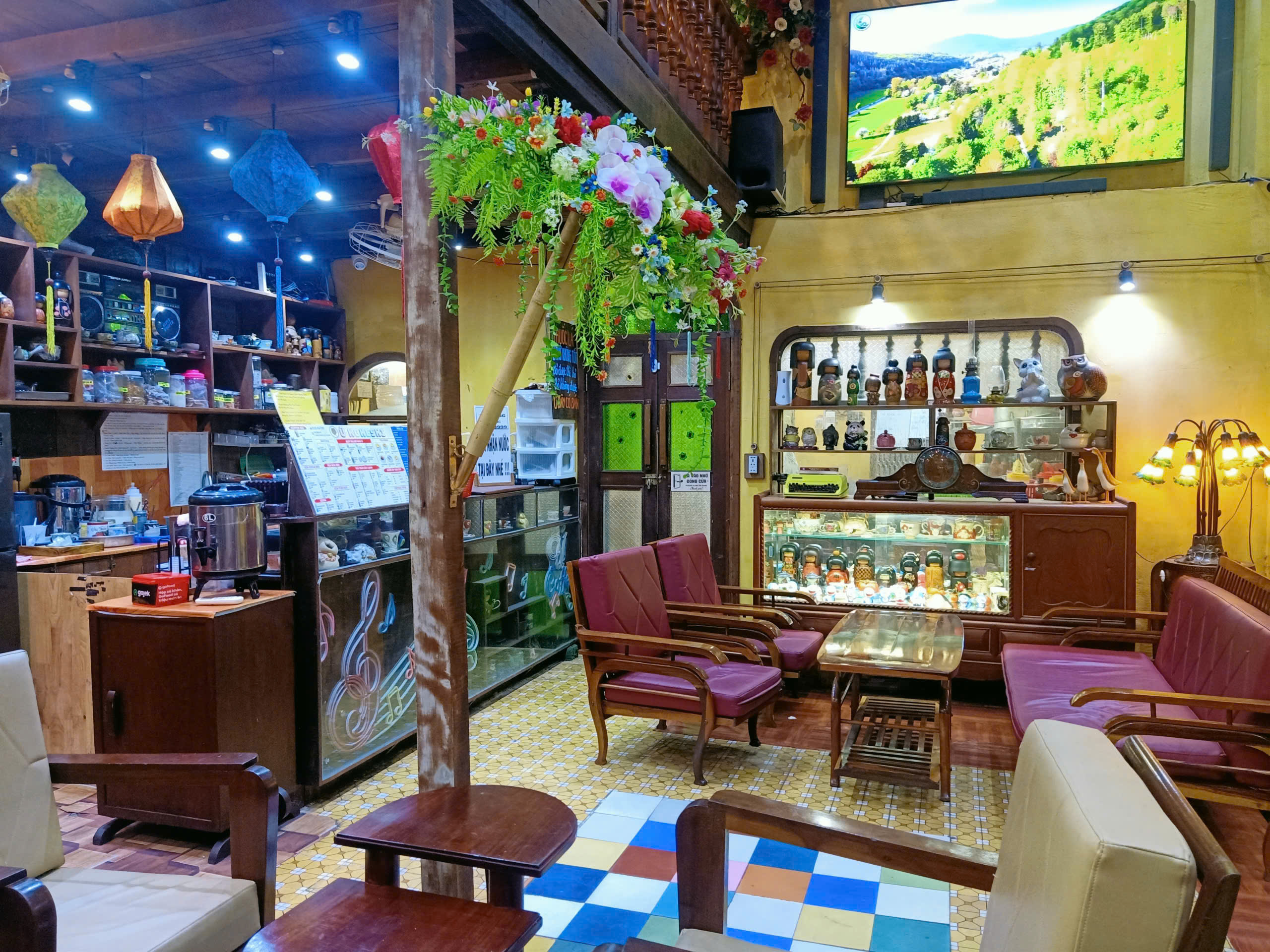Vừa bước chân vào quán, tôi đã phải trầm trồ thốt lên rằng “Ôi, sao đẹp quá!”. Không gian được thiết kế vô cùng đặc biệt, mang nét cổ điển xa xưa. Sàn nhà sọc caro, những bộ bàn ghế gỗ mộc mạc, giản dị được điêu khắc tỉ mỉ tạo cảm giác gần gũi, ấm cúng, phủ bên trên là lớp đệm dày màu đỏ đô êm ái. Trên tường treo đầy những bức tranh phong cảnh thiên nhiên tươi đẹp.