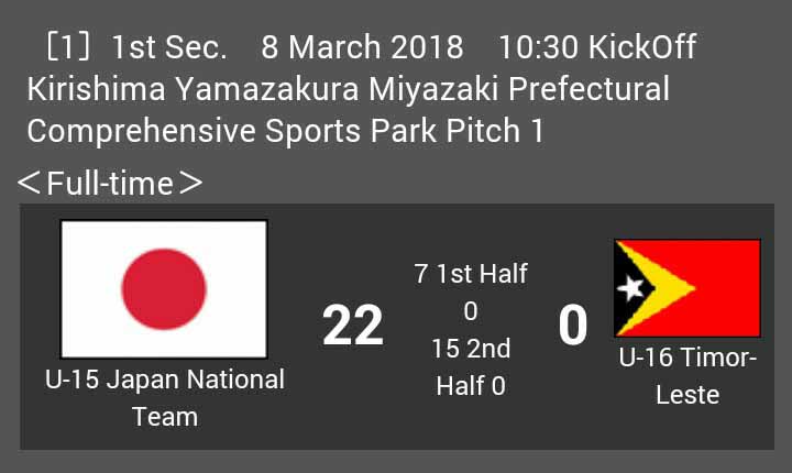 Trong hiệp thi đấu đầu tiên, U16 Nhật Bản đã có 7 lần làm rung lưới Đông Timor. Sang hiệp hai, thể lực xuống, Đông Timor đã vỡ trận và ở hiệp này họ còn để thủng lưới thêm 15 bàn nữa để chấp nhận thua chung cuộc 0-22 trước U16 Nhật Bản. Đây có thể nói là một tỉ số quá đậm cho một trận đấu dù nó chỉ mang tính chất giao hữu.