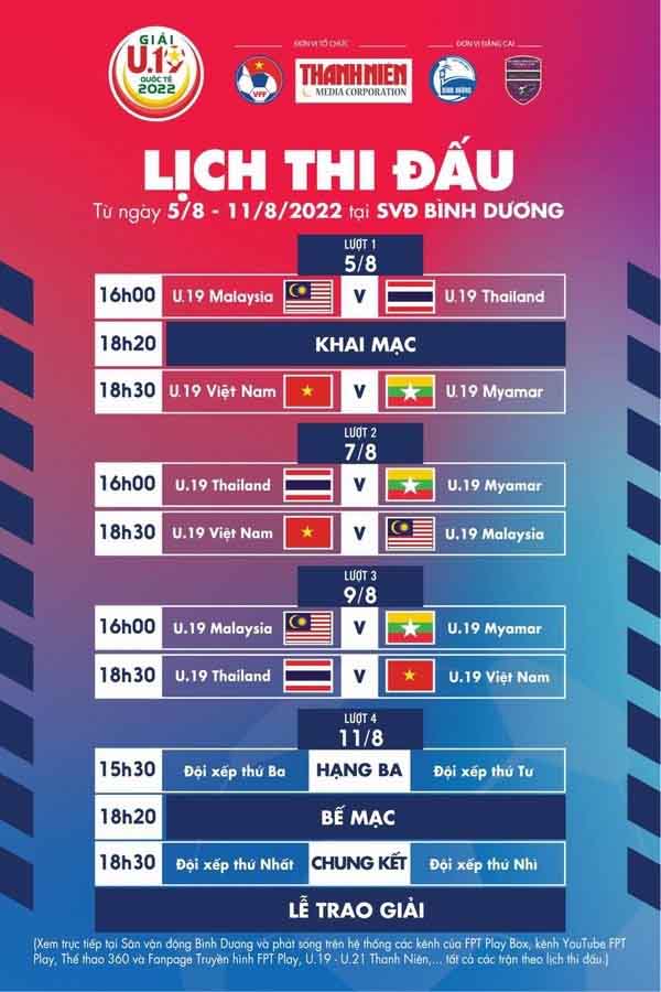 Theo lịch thi đấu, U.19 Việt Nam sẽ đấu trận khai mạc với U.19 Myanmar lúc 18 giờ 30 ngày 5.8, sau đó lần lượt chạm trán U.19 Malaysia lúc 18 giờ 30 ngày 7.8, U.19 Thái Lan lúc 18 giờ 30 ngày 9.8. Hai đội xếp nhất, nhì vòng loại sẽ tranh chung kết vào lúc 18 giờ 30 ngày 11.8, hai đội còn lại tranh hạng ba lúc 15 giờ 30 cùng ngày