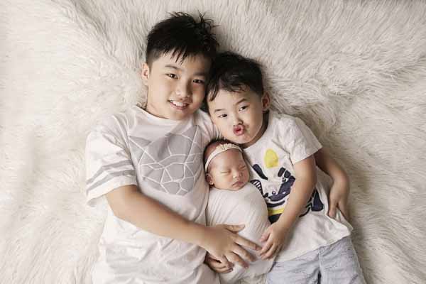 Hai con trai tuy còn nhỏ tuổi nhưng cũng ý thức được mình đã lên chức anh và rất thích nằm cạnh, hôn em gái nhỏ nhất nhà. Mỗi khi nhìn thấy “3 cục vàng”, Kim Cương cảm thấy vô cùng bình yên.