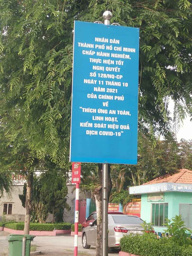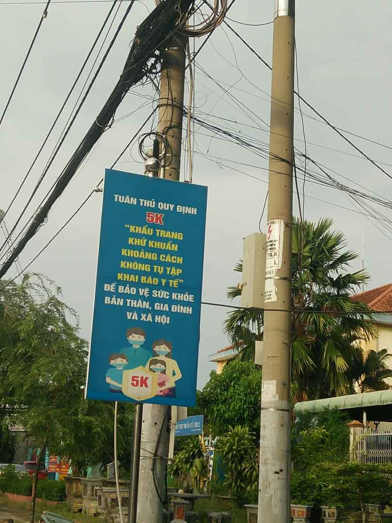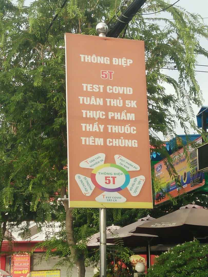 Song song đó vẫn kết hợp thông điệp 5T: là test Covid, tuân thủ nghiêm 5K, thực phẩm đủ tại nhà, thầy thuốc đến tận gia, tiêm chủng tại phường, xã được tuyên truyền với nhiều hình thức, dọc các tuyến đường tỉnh lộ 8, huyện Củ Chi đều có băng rôn tuyên truyền như hình ảnh dưới đây.