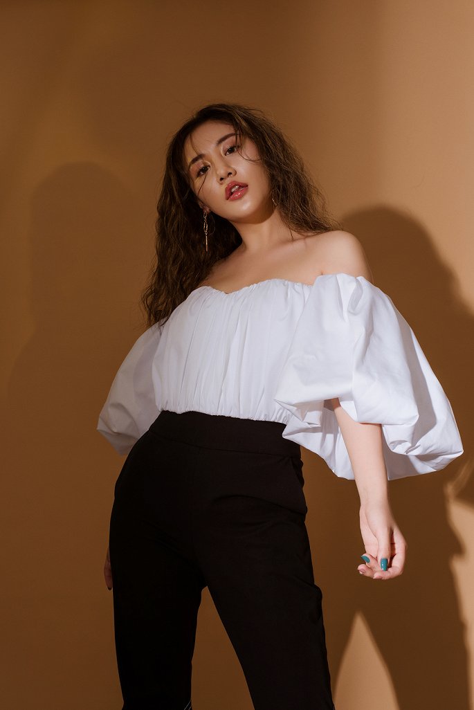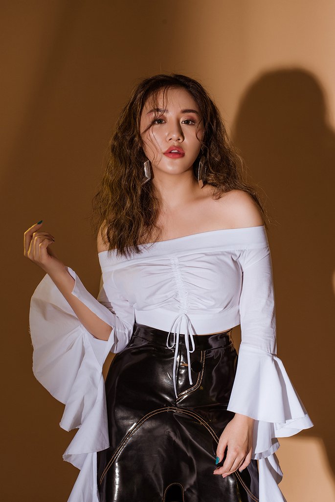 Tự tin khoe vai trần quyến rũ bên cạnh đó, mái tóc uốn xù và kiểu trang điểm nhẹ nhàng giúp nữ ca sĩ trở nên cá tính hơn.