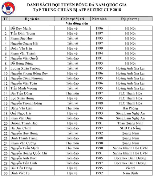 Trong danh sách sơ bộ ban đầu của HLV Park Hang-seo có Văn Thanh, nhưng hậu vệ này mới bị đứt dây chằng, phải nghỉ thi đấu khoảng nửa năm nên bị gạch tên vào phút chót. HAGL chỉ còn 5 cái tên quen thuộc, gồm Xuân Trường, Hồng Duy, Công Phượng, Văn Toàn và Minh Vương.