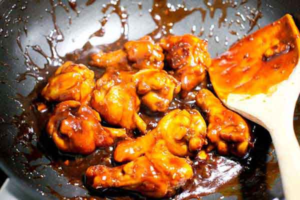 + Khi cánh gà chuyển sang màu đỏ, phần nước sốt sánh lại thì tắt bếp, rắc thêm hạt vừng trắng và hành lá lên.