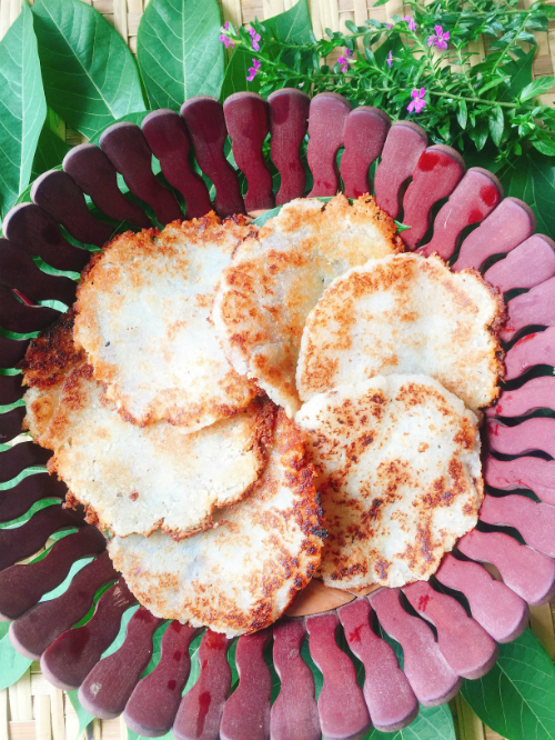 – Chảo nóng cho ít dầu, lấy một ít khoai cho vào chảo dùng muỗng đè thành một lớp mỏng rồi nướng với lửa nhỏ để bánh được chín đều, trở mặt thường xuyên cho bánh vàng giòn. Dùng nóng sẽ ngon hơn.