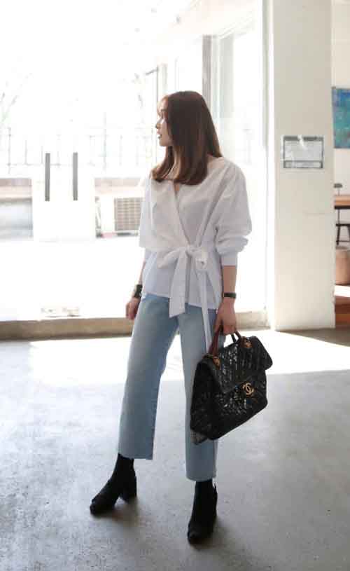 Đây là kiểu trang phục đơn giản nhưng vẫn toát lên nét cá tính riêng biệt. Áo vạt đi cùng jeans suông tạo thoải mái cho người mặc.