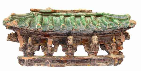 Mảnh mô hình tháp men xanh lục mô tả kết cấu đấu củng, thời Lê Sơ, khai quật được tại khu vực điện Kính Thiên năm 2021