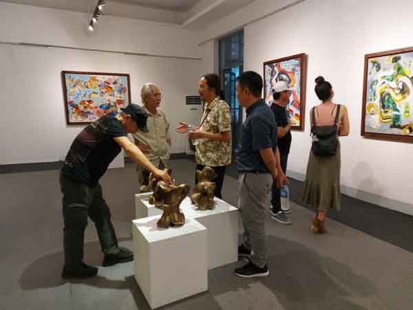 Họa sĩ Trần Lưu Mỹ (giữa) đang trao đổi với các họa sĩ Ca Lê Thắng, Điêu khắc gia Đào Châu Hải và nhà sưu tập Mai Gallery tại triển lãm “Giấc mơ siêu thực”.