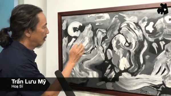 Họa sĩ Trần Lưu Mỹ đang phân tích về kỹ thuật trong tranh Đinh Phong với phóng viên Truyền hình chương trình “Kiến thức gia đình”.