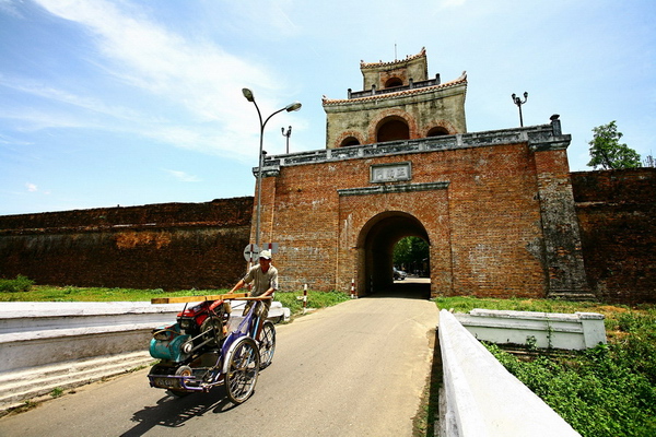Cổng thành của Kinh thành Huế. Kinh thành Huế được vua Gia Long xây dựng từ năm 1805, và cơ bản hoàn thành năm 1832 dưới triều vua Minh Mạng. Kinh thành có 10 cổng chính, được xây cuốn vòm, bên trên có vọng lâu.