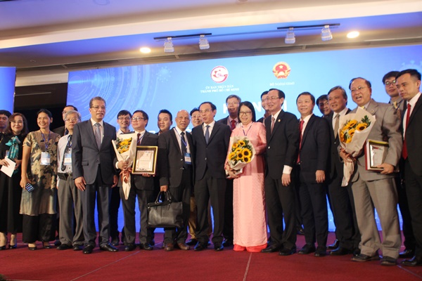 Lãnh đạo TP.HCM tặng hoa cho Kiều bào sau Hội nghị – Ảnh: Tiểu Vũ