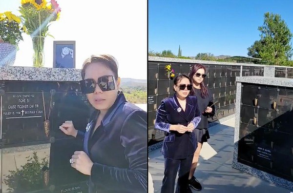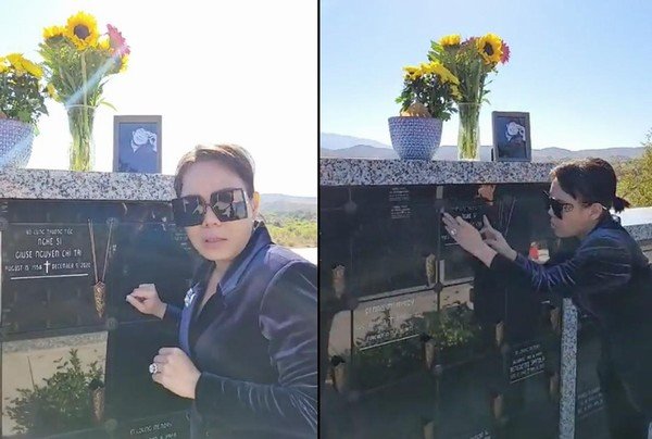 Sau khi đưa tro cốt Phi Nhung về Mỹ, Việt Hương cùng ông xã dành thời gian đến thắp hương cho nghệ sĩ Chí Tài. Ca sĩ Phương Loan – bà xã nam danh hài cũng đến thăm chồng. Trong video, Việt Hương chia sẻ: “Tôi là người đưa anh Tài ra sân bay. Việc đầu tiên của hai vợ chồng tôi khi về Mỹ là thăm anh Tài. Vì tôi giống như em của anh Tài nên cũng mong muốn anh ấy được ở chỗ đẹp”.