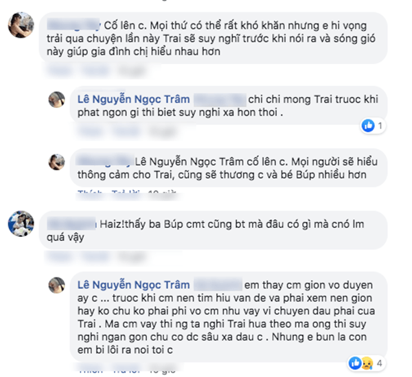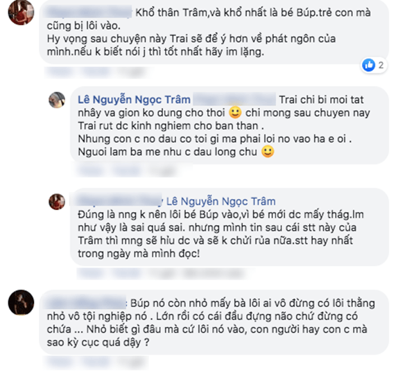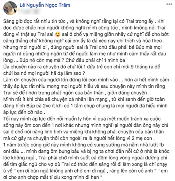 Nhưng mọi người ơi, đúng người sai là Trai chứ đâu phải bé Búp mà mọi người nhắn tin dùng những ngôn từ để người làm mẹ như mình cảm thấy rất đau lòng… Búp nó còn mẹ mà, chứ đâu phải chỉ 1 mình ba. Ủa chuyện nào ra chuyện đó chứ lôi 1 đứa trẻ con chỉ mới 9 tháng ra để chửi ba nó mọi người hả dạ lắm sao?