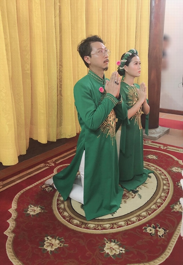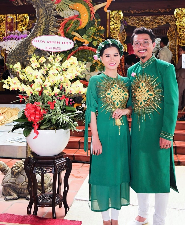 Vợ chồng Hứa Minh Đạt – Lâm Vỹ Dạ diện áo dài đôi đi cúng Tổ nghề sân khấu