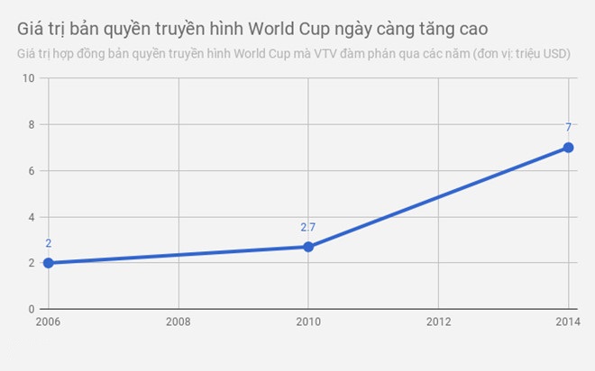 Cũng tương tự với các quốc gia khác, giá bản quyền truyền hình World Cup mà Việt Nam mua về tăng dần sau từng kỳ. Mức giá này tăng từ 2 triệu USD năm 2006 lên 2,7 triệu USD năm 2010, gần 7 triệu USD năm 2014.