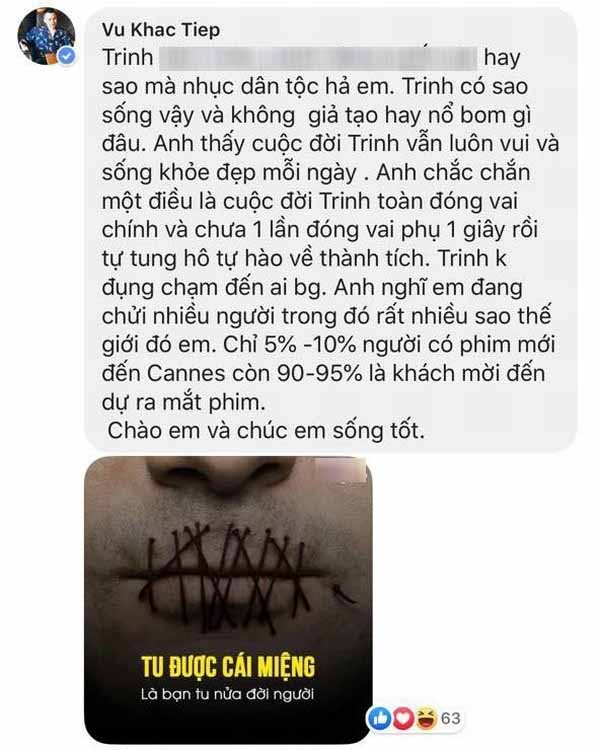 Vũ Thu Phương vui vẻ khi nhiều người ủng hộ cô phê phán Ngọc Trinh. Cụ thè bài viết của cô trên trang cá nhân thu hút 20 nghìn lượt ‘like’, gần 3.000 bình luận và 2,5 ngàn lượt chia sẻ.