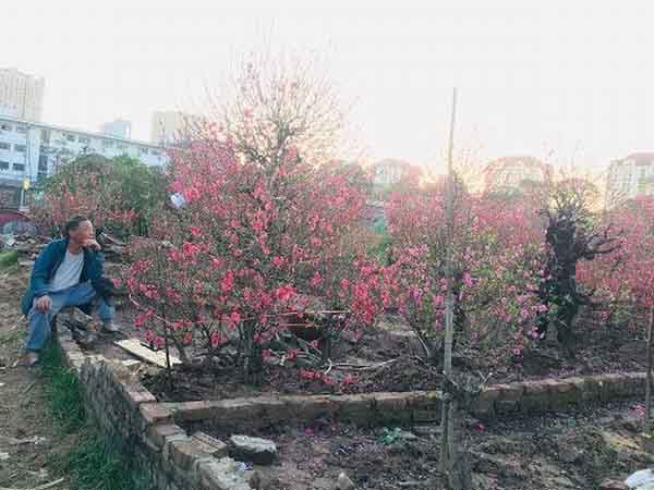 Thờ thẫn ngồi bên vườn đào cả buổi chiều 29 Tết (10.2), bác Bôn – một nghệ nhân trồng đào hàng chục năm ở làng Nhật Chiêu (Nhật Tân, Tây Hồ, Hà Nội) nói với PV: Chỉ còn một ngày nữa là bước sang năm mới, vườn đào của tôi đã nhuộm đỏ sắc hoa đào, cả vườn rực rỡ khi tết đến xuân về. Năm nay thời tiết ấm, có nắng nên hoa đào bung nở đều, đúng dịp Tết.