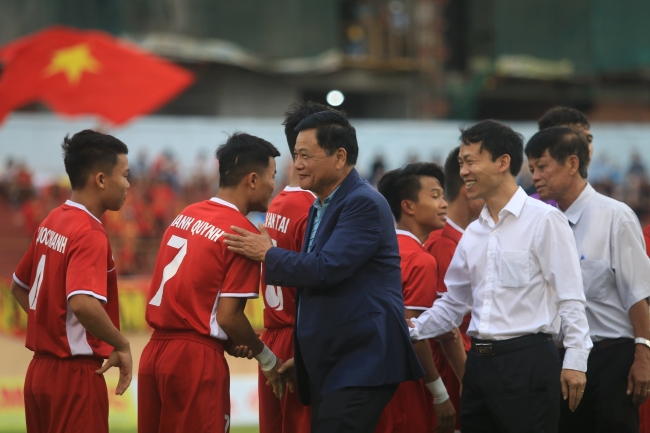 Ban tổ chức giải tặng hoa động viên các cầu thủ trước trận đấu