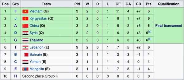 Còn lại, U.20 Việt Nam (bảng F), U.20 Kyrgyzstan (bảng J ), U.20 Trung Quốc (bảng A) và U.20 Syria (bảng D) lần lượt là 4 đội nhì bảng có thành tích tốt nhất giành đi tiếp vào vòng chung kết.