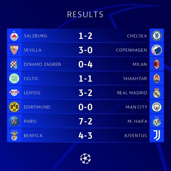 Ở kết quả các trận đấu khác, tại bảng H RB Leipzig đã có chiến thắng 3-2 trước Real Madrid (đội bóng đã đi tiếp trước đó). Celtic và Shakhtar cũng đã có trận hòa nhau với tỷ số 1-1.