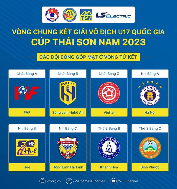 8 đội xuất sắc giành quyền vào tứ kết giải vô địch U.17 quốc gia – Cúp Thái Sơn Nam 2023 gồm: PVF, Sông Lam Nghệ An, Viettel, Hà Nội, Huế, Hồng Lĩnh Hà Tĩnh, Khánh Hòa và Bình Phước.