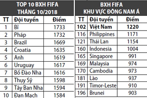Trên bảng xếp hạng mới được Liên đoàn bóng đá thế giới (FIFA) công bố tính đến tháng 10/2018, ĐT Việt Nam tiếp tục giữ vị trí thứ 17 trong khu vực Châu Á và vị trí thứ 102 trên thế giới. Không những vậy, trong khu vực Đông Nam Á, ĐT Việt Nam không những tiếp tục dẫn đầu bảng, mà còn bỏ xa các đối thủ khác.