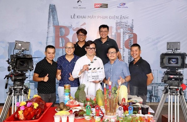 Trấn Thành cùng dàn ekip của mình trong ngày khai máy dự án phim điện ảnh từ web-drama “Bố già”.