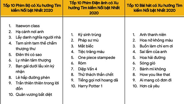 10 từ khóa của Xu hướng tìm kiếm nổi bật của Việt Nam 2020 là một danh sách đặc biệt khi có đến 4/10 từ khóa liên quan đến học trực tuyến, 3/10 từ khóa về lĩnh vực giải trí, phản ánh mối quan tâm và cách người Việt đối diện với một năm chưa từng có tiền lệ của dịch bệnh, giãn cách xã hội, đóng cửa trường học, và “Ở nhà là yêu nước”.