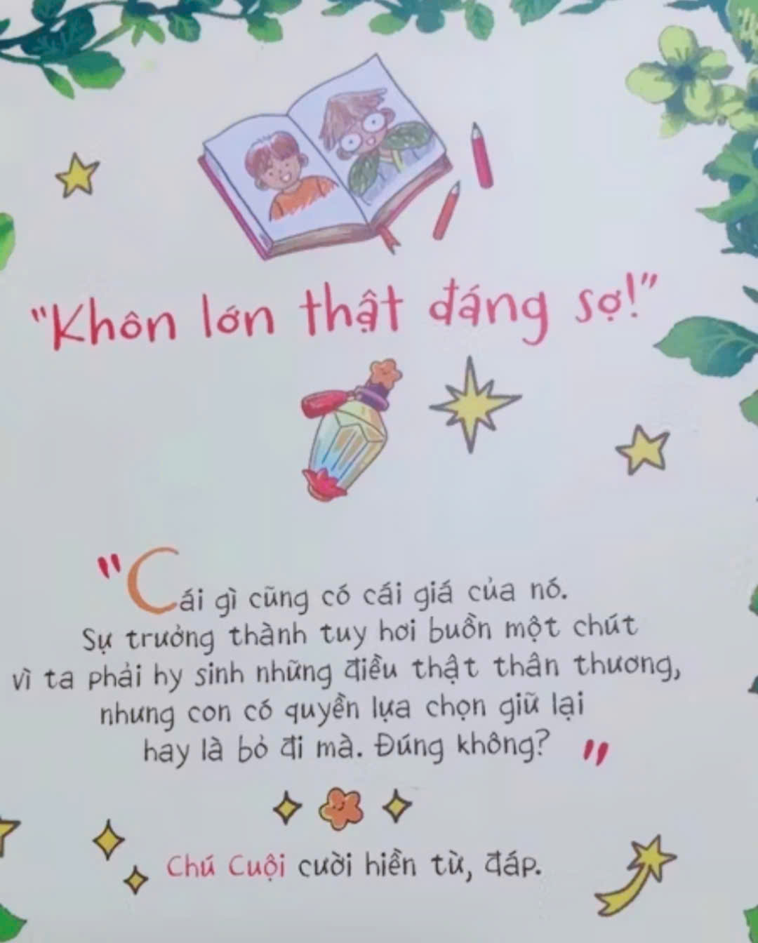 Tôi ấn tượng nhất với câu nói được trích trong cuốn sách: “Có những mục tiêu rất lớn lao để vội vàng theo đuổi, nhưng không phải vì thế mà ta lại bỏ qua những điều khiến mình mỉm cười vu vơ”. Câu nói ấy đã làm tôi dừng lại để suy ngẫm nhiều hơn. Tôi tự hỏi: “Đã bao lâu rồi mình không mỉm cười vu vơ một cách vô thức như thế?”. Cuộc sống bận rộn và vất vả khiến chúng ta luôn trong guồng quay vội vã. Ta mệt mỏi sau những giờ tăng ca triền miên ngày này qua ngày khác, ta miệt mài theo đuổi những ước mơ, hoài bão, ta khát vọng những điều to lớn, vĩ đại, sẵn sàng lao vào vòng xoáy để đạt được điều mình mong muốn. “Những khuôn khổ, rào cản, trách nhiệm, bổn phận, hay những phán xét, quy định chẳng phải là chiếc lồng giam vô hình khiến cho chúng ta từng ngày kiệt quệ và héo mòn hay sao?”. Cuộc sống dạy chúng ta bài học về sự trưởng thành, nhưng cũng khiến ta lo nghĩ và bận tâm nhiều hơn. Và rồi không biết tự bao giờ, ta cũng quên đi cách mỉm cười ngây thơ, vô tư, hồn nhiên như một đứa trẻ.