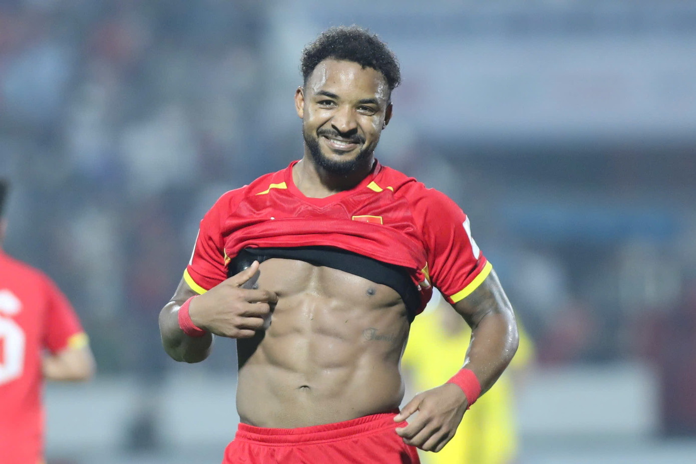 Xuân Son ăn mừng bàn thắng bằng cách khoe cơ bụng 8 múi để đáp trả những ý kiến về cân nặng của anh sau trận đấu với Bangladesh – Ảnh: Báo Tiền Phong