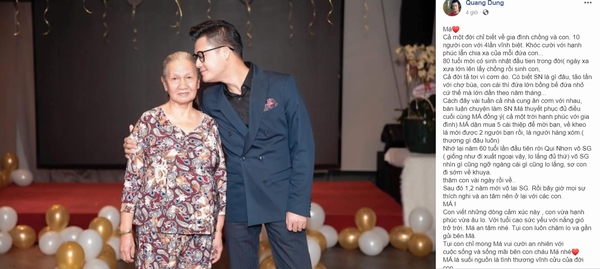 Viết trên trang cá nhân, nam ca sĩ khiến mọi người xúc động khi đọc được những dòng tâm sự dành mẹ của mình. Được biết, mẹ của Quang Dũng năm nay đã 80 tuổi, bà đã dành hết tuổi xuân để nuôi dạy, lo lắng và chăm sóc gia đình.
