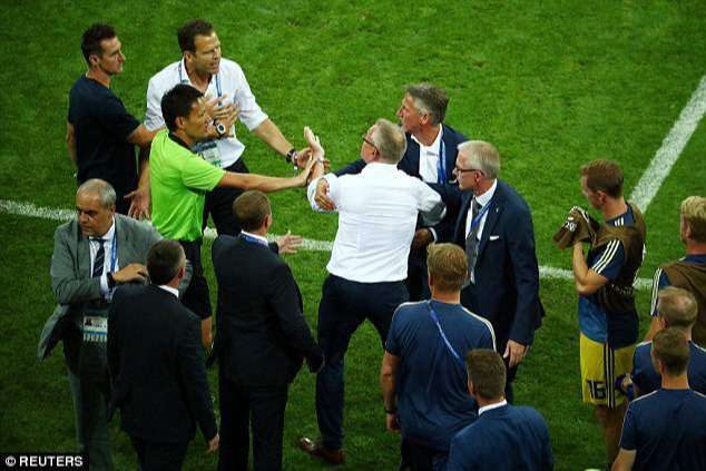 HLV Andersson và các cầu thủ dự bị của Thụy Điển giận dữ và lao về phía ban huấn luyện tuyển Đức vì một số cầu thủ của đội vô địch thế giới có hành động khiêu khích khi ăn mừng bàn thắng của Kroos.