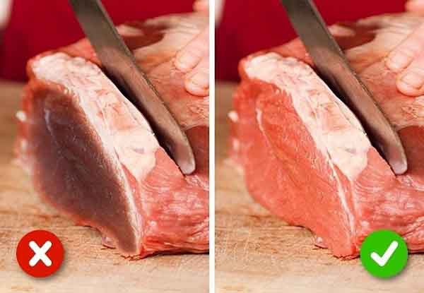 Dùng ngón tay bấm vào miếng thịt lợn, bò. Nếu khi thả ra dấu tay mất đi thì thịt tươi. Nếu miếng thịt có màu sẫm khác thường, có vệt trắng là thịt để lâu, chứa chất bảo quản.