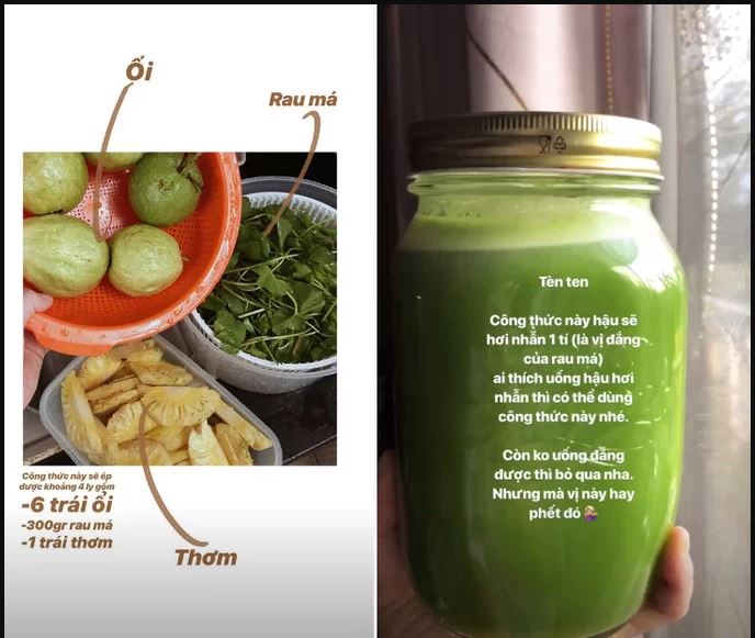 Đây là bữa sáng thường xuyên của Yến Trang. Cô liên tục cập nhật các công thức sinh tố mà mình sử dụng trên trang cá nhân. Cô áp dụng phương pháp Deep Green Smoothie với đặc điểm chính là các nguyên liệu đều có màu xanh, chứa hàm lượng đường thấp và nhiều chất diệp lục. Yến Trang chia sẻ, thời điểm tốt nhất để uống sinh tố rau củ là là khi bụng đói, vào buổi sáng hoặc buổi chiều. Cô thường có thói quen uống trước khi ăn sáng khoảng 30 phút hoặc sau khi ăn no khoảng 2 tiếng. Nữ ca sĩ cũng nhấn mạnh việc không nên uống sinh tố ngay khi vừa ăn xong hoặc khi bụng đang quá no.