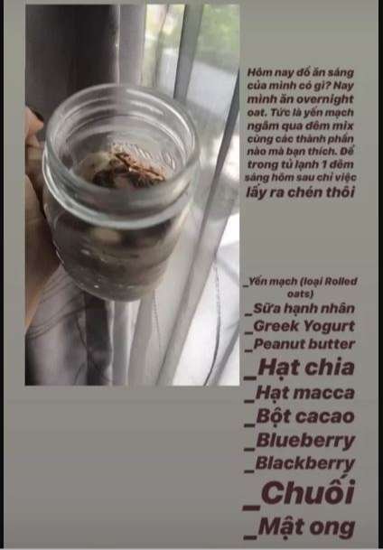 Overnight Oat (yến mạch ngâm qua đêm) không phải là bữa sáng quen thuộc với người Việt nhưng ở phương Tây, đặc biệt là với những người tập gym, đây là bữa sáng giàu dinh dưỡng với đầy đủ chất xơ, vitamin, tinh bột, chất đạm và chất béo lành mạnh. Thời gian để chế biến món này chỉ mất chưa đầy 5 phút và có thể thay đổi tùy theo sở thích, khẩu vị mỗi ngày. Bạn cần chuẩn bị yến mạch cán hoặc yến mạch hữu cơ, sữa tươi hoặc sữa hạt tùy khẩu vị, các loại hạt như hạt chia, bí ngô, hạnh nhân kết hợp với các loại quả theo mùa. Cho các thành phần trên vào hũ hoặc cốc sạch, để trong tủ lạnh tối thiểu là 8 tiếng, tốt nhất là để qua đêm, để yến mạch đủ thời gian hấp thụ đầy đủ hương vị. Sáng hôm sau, bạn có thể thưởng thức sau khi đã khuấy đều các thành phần. Nếu muốn ăn nóng, bạn có thể quay trong lò vi sóng để làm ấm mà không sợ làm mất đi thành phần dinh dưỡng.