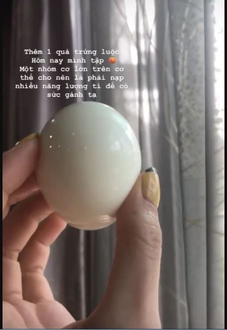 Trứng luộc là món ăn được nhiều chuyên gia thể hình gợi ý cho bữa sáng. Các chuyên gia dinh dưỡng đều nhận định, trứng gà là thực phẩm có giá trị dinh dưỡng cao, được coi là “thực phẩm dinh dưỡng toàn phần”. Một quả trứng chứa 70 calo, chứa nguồn protein tuyệt vời giúp ổn định lượng đường trong máu. Bên cạnh đó, trứng còn chứa các axit amin thiết yếu, chất sắt cho cơ thể. Yến Trang kết thúc bữa sáng với một quả trứng luộc để có thêm năng lượng cho buổi tập sau đó.