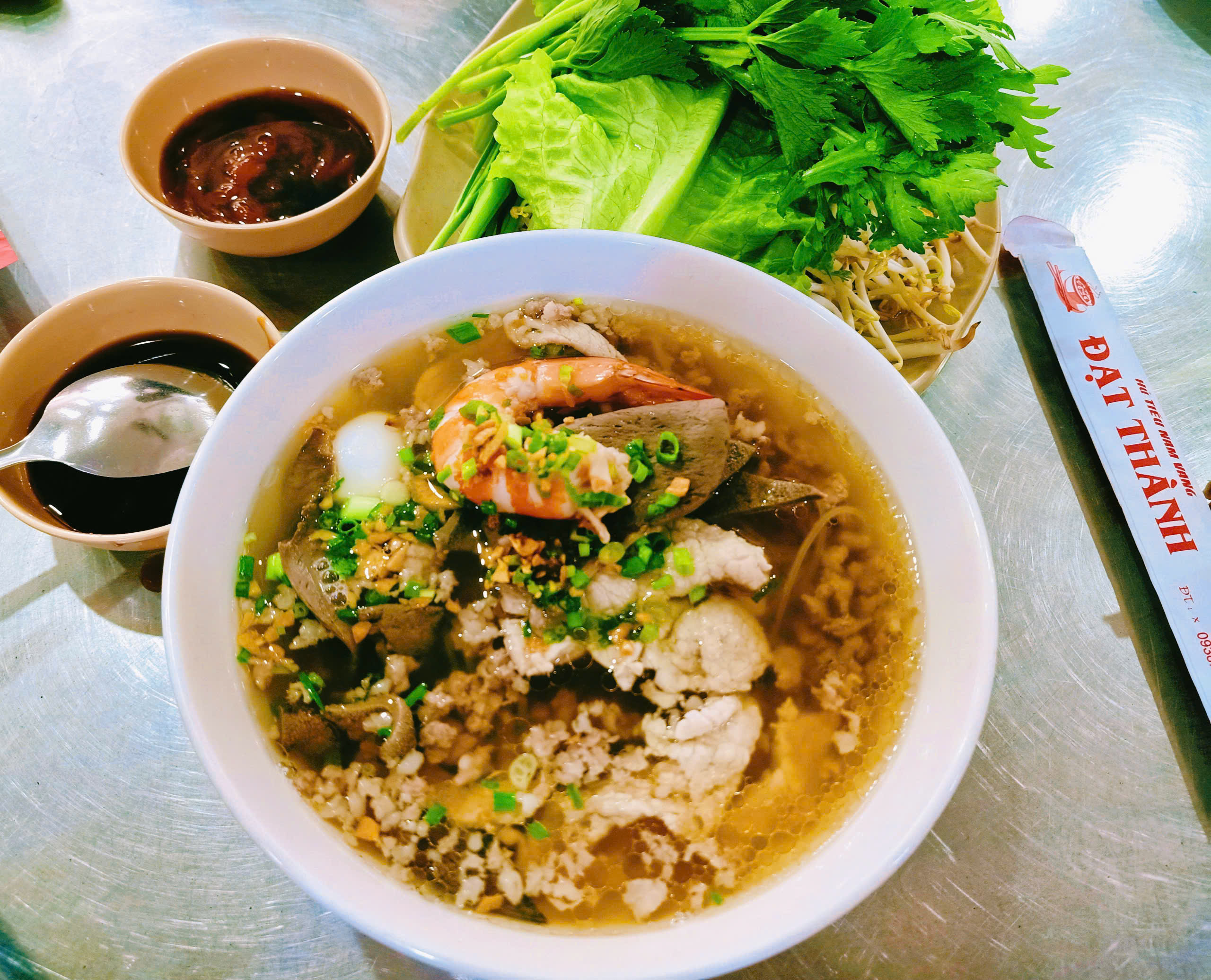 Nếu có dịp được ghé hủ tiếu Đạt Thành ở đường Nguyễn Thị Thập, phường Tân Thuận, có lẽ bạn sẽ không thể quên được hương vị nơi đây. Tô hủ tiếu có màu sắc thu hút, nhìn là muốn thưởng thức ngay. Topping đa dạng, "ê hề" với thịt heo, tôm, chả cá, trứng cút, mực,…