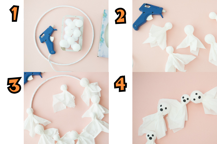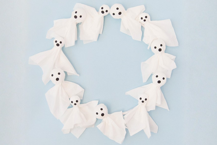 - Bước 2: Quấn một tờ giấy ăn khác quanh quả bóng, bó nhẹ phần cổ để tạo hình đầu và thân ma. Dùng keo nến (chỉnh ở nhiệt độ thấp nếu dùng bóng xốp) cố định phần cổ lại để giữ dáng. Lặp lại bước này cho đến khi bạn có đủ số “bóng ma” mong muốn. (Nếu dùng bóng bàn hoặc bóng xốp, bạn có thể tháo vòng hoa ra sau lễ và tái sử dụng vật liệu cho những lần thủ công khác.)