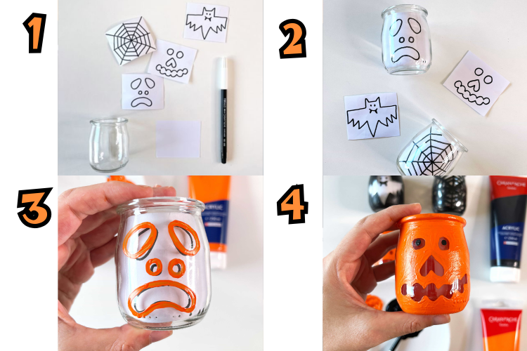 Để bắt đầu, bạn chỉ cần chuẩn bị: sơn acrylic (màu cam, đen hoặc trắng tùy họa tiết), bảng pha màu, bút dạ đen, cọ tròn, vài tờ giấy nháp, lọ thủy tinh hoặc hũ tái chế và nến tealight nhỏ.