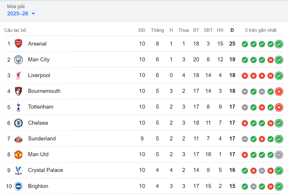Bảng xếp hạng Top 10 Ngoại hạng Anh thời điểm hiện tại