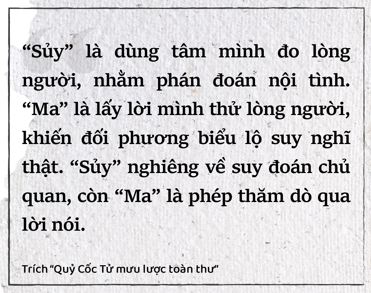 Quỷ Cốc Tử từng nhấn mạnh nguyên lý tự nhiên: “Cố vật quy loại, bão tân xu hỏa, táo giả tiên nhiên; Bình địa chú thủy, thấp giả tiên nhu. Thử vật loại tương ứng, vu sự tỷ do thị dã”, tức là khi vứt củi khô và củi ướt vào lửa, củi khô cháy trước; khi đổ nước lên mặt đất, nơi trũng sẽ ướt trước. Vật thể phản ứng theo đặc tính vốn có. Con người cũng tương tự, những người có điểm chung về tính cách, hoàn cảnh thường dễ đồng cảm và kết nối với nhau hơn. Vận dụng vào thực tiễn, người nắm thuật “Ma” có thể thiết kế tình huống tương ứng để đối phương tự bộc lộ bản chất – giống như thử lửa thì biết gỗ khô hay ướt.