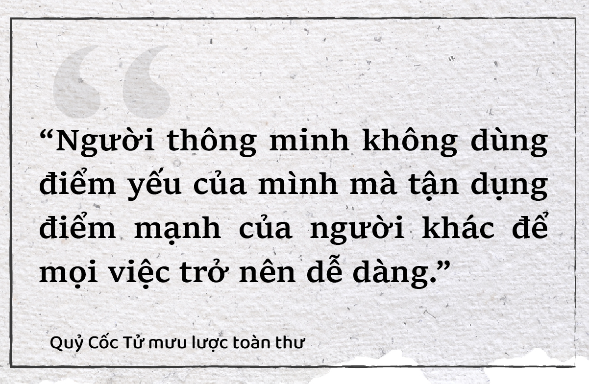 Quỷ Cốc Tử cũng viết: “Người thông minh khi làm việc sẽ không dùng điểm yếu của mình, mà thường dùng điểm mạnh của người khác; không dùng cái lóng ngóng, vụng về của mình mà lợi dụng sự khéo léo, tinh tế của người khác, làm vậy mọi việc sẽ trở nên đơn giản, không còn khó khăn nữa.” Ứng dụng trong đời sống hiện đại, đó là tinh thần biết khai thác trí tuệ, kinh nghiệm và nguồn lực của người khác để bổ sung cho thiếu sót của bản thân. Trong kinh doanh, điều ấy đồng nghĩa với việc học hỏi từ đối thủ, từ đồng nghiệp, từ đội ngũ để hoàn thiện sản phẩm, dịch vụ và nâng cao hiệu quả công việc.