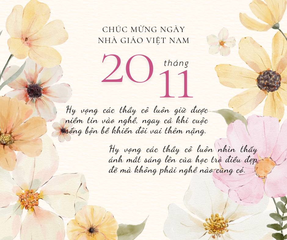 Tôi muốn gửi lời chúc đến tất cả những người làm nghề giáo rằng: hy vọng các thầy cô luôn giữ được niềm tin vào nghề, ngay cả khi cuộc sống bộn bề khiến đôi vai thêm nặng. Hy vọng các thầy cô luôn nhìn thấy ánh mắt sáng lên của học trò điều đẹp đẽ mà không phải nghề nào cũng có.